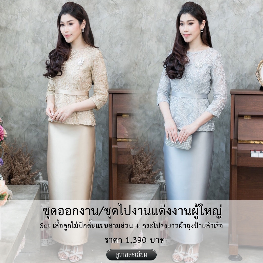 ชุดออกงาน/ชุดไปงานแต่งงานผู้ใหญ่สี Set เสื้อลูกไม้แขนสามส่วนเอวระบาย รุ่นนี้ทางร้านใช้ลูกไม้ปักดิ้นเนื้อดีเกรดพรีเมี่ยมสั่งทำพิเศษ มีดีเทลที่อกด้านในเย็บฟองน้ำดันทรงอย่างดี แขนเสื้อและที่เอวระบายแต่งระบาย มาพร้อมกับกระโปรงผ้าถุงป้ายสำเร็จ ตัวกระโปรงทางร้านใช้ผ้าไหมอย่างดีเกรดพรีเมี่ยม รุ่นนี้มาในลุคสาวสังคมชั้นสูงดูหรูหราแต่ใส่ง่ายมากคะ ขอบอกเลยงานเย็บคัตติ้งเปะจ้า ด้านในเย็บซับในอย่างดี รับรองใส่สวยไฮโซสุดๆ สไตล์เรียบหร สวยสง่า ดูดีมากๆๆ เหมาะสำหรับใส่เป็น ชุดออกงานสไตล์ผู้ใหญ่ ชุดไปงานแต่งงานผู้ใหญ่ ชุดแม่เจ้าสาว ชุดแม่เจ้าบ่าว ชุดถือขันหมวก