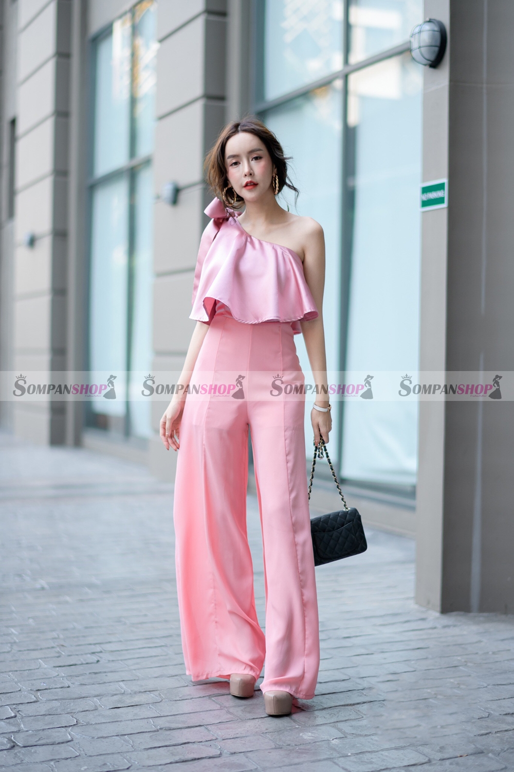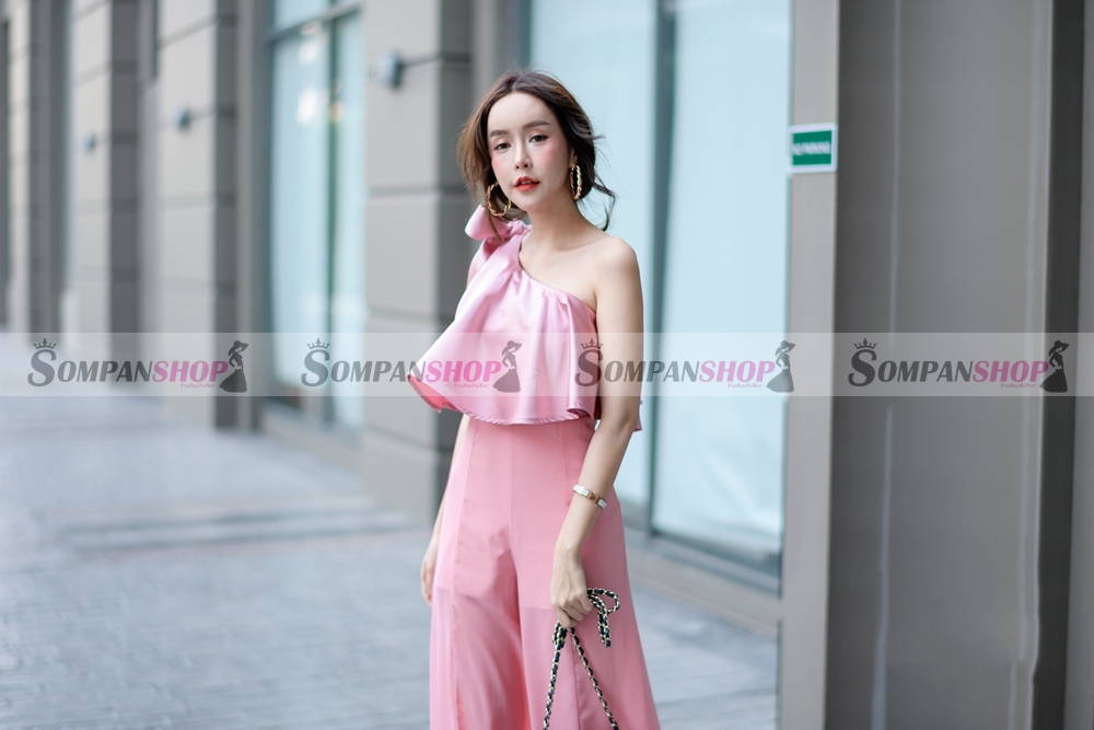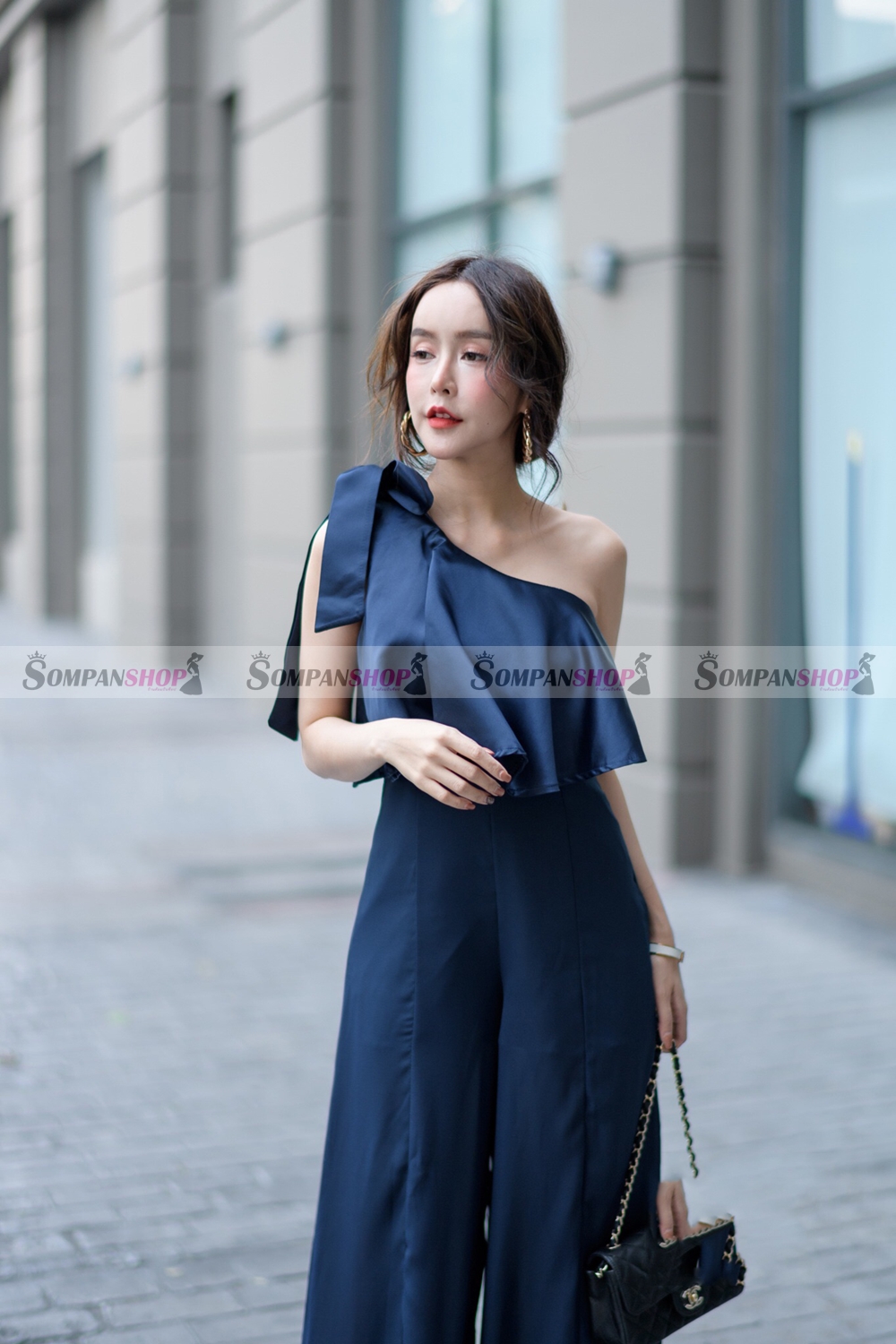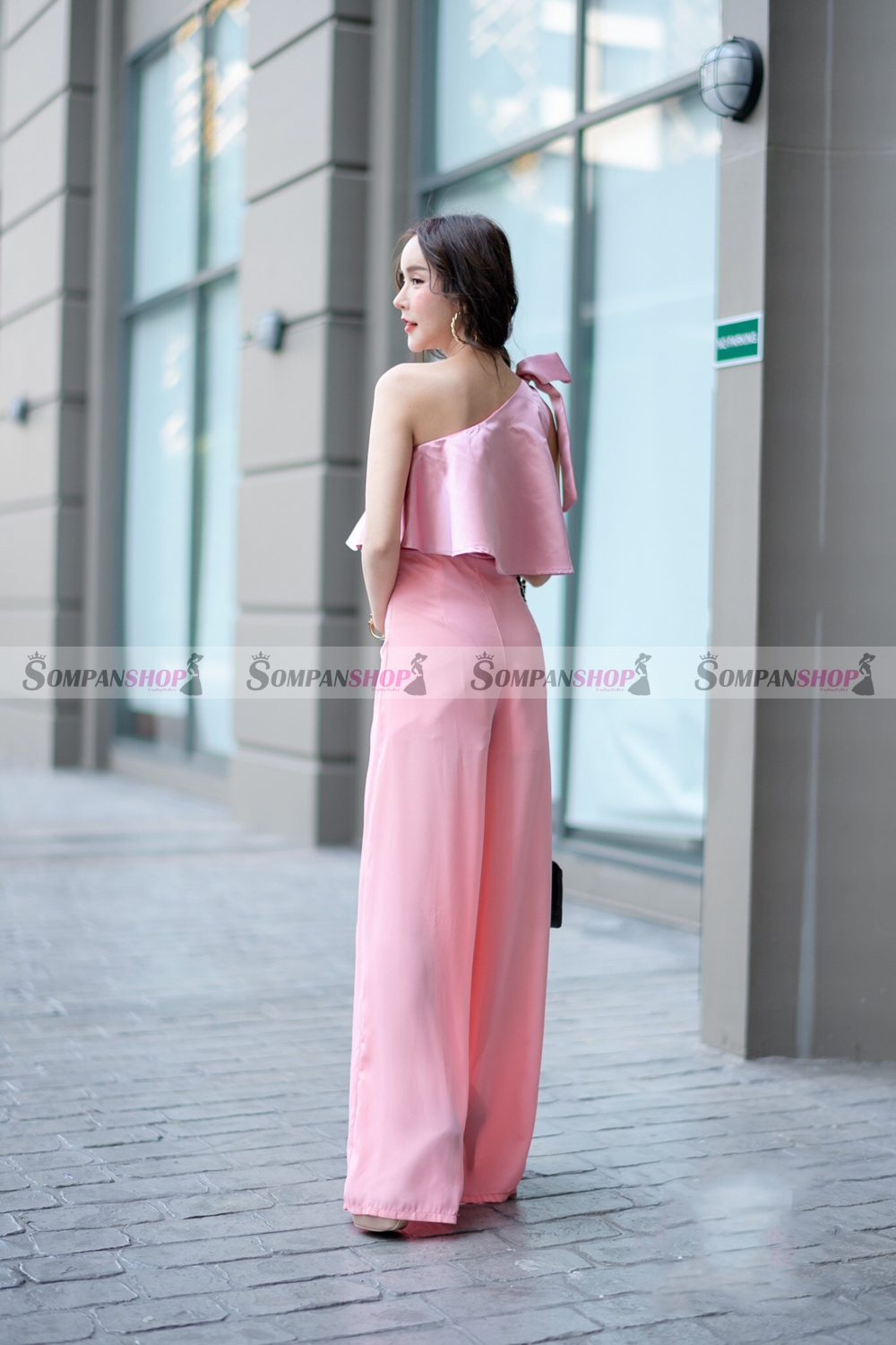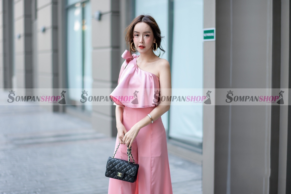 ชุดเดรสกางเกงขายาว ไหล่เฉียงแต่งระบาย ประดับโบว์ที่หัวไหล่ กางเกงขายาวทรงบาน ขากว้างสุดเก๋ ผ้าซาตินมันเงา เนื้อผ้าหนามีน้ำหนัก ดูสวยหรู สามารถใส่ได้โอกาส ทั้งใส่เป็นชุดไปงานแต่งงาน ชุดออกงาน หรือจะใส่เป็นชุดใส่ในวันหยุดสบาย จะลุคสวยเก๋ ดูดีสุดๆไปเลย