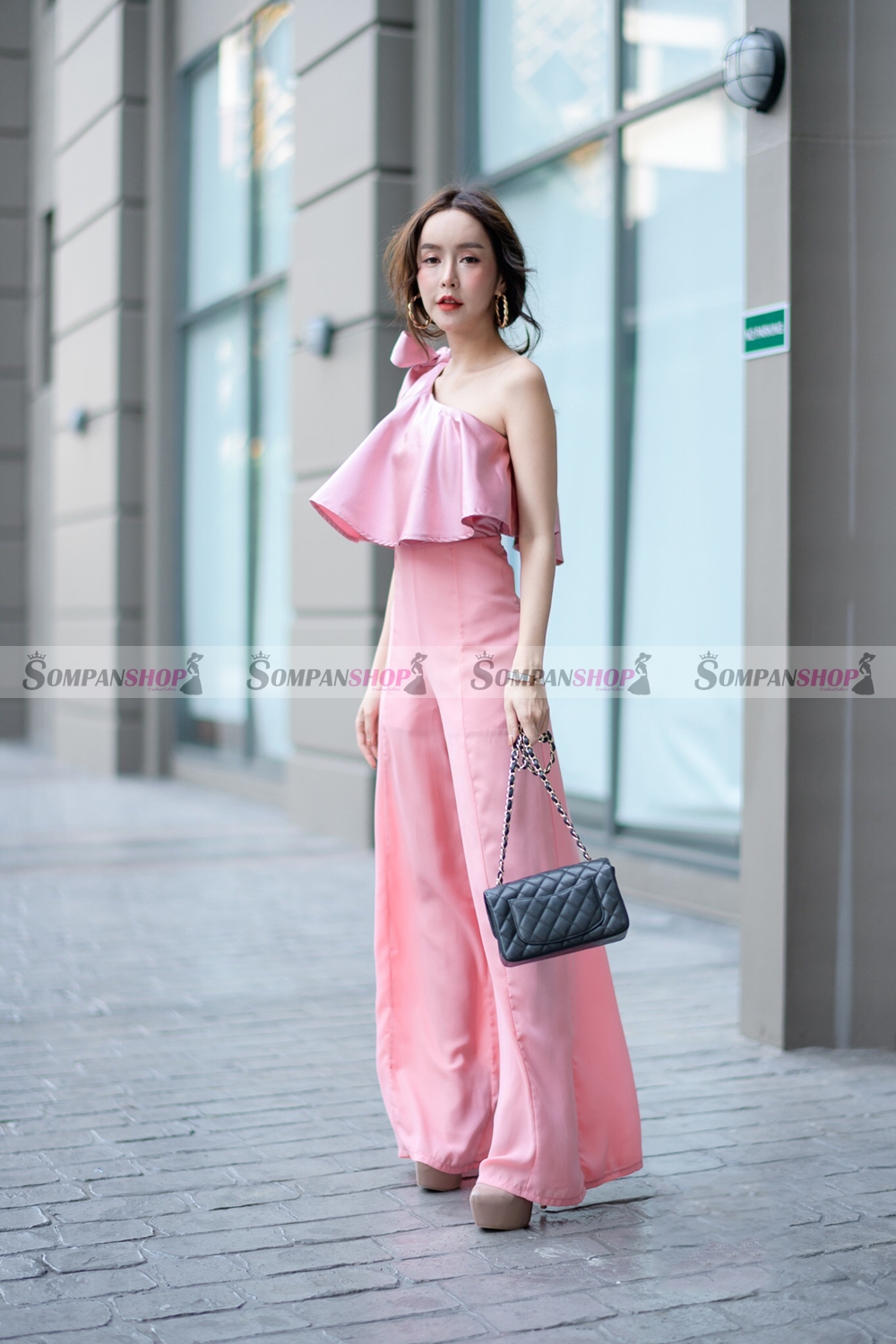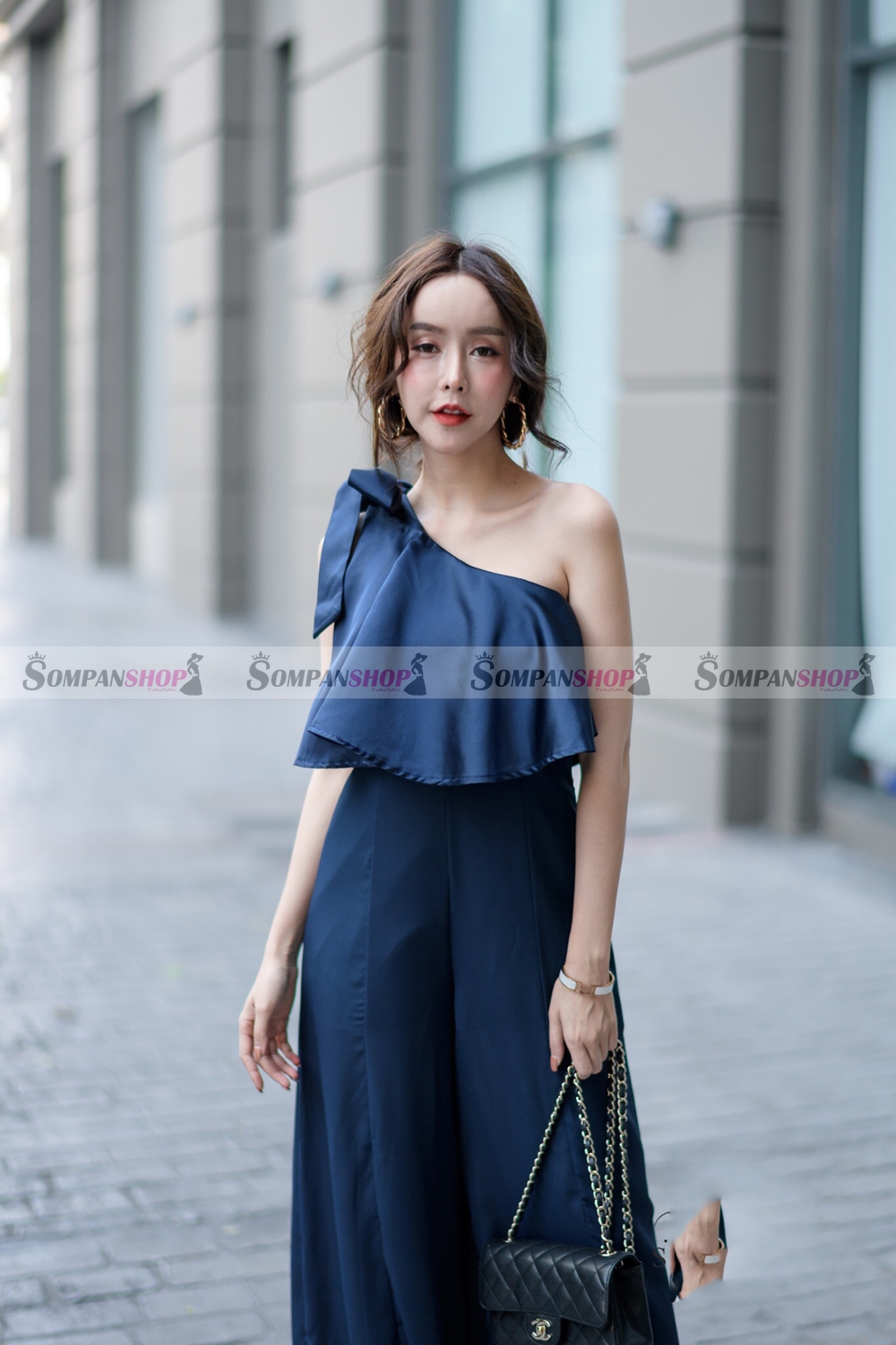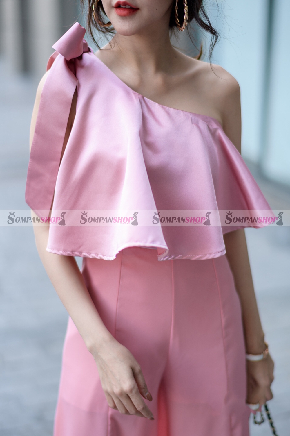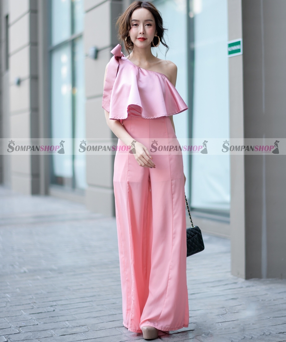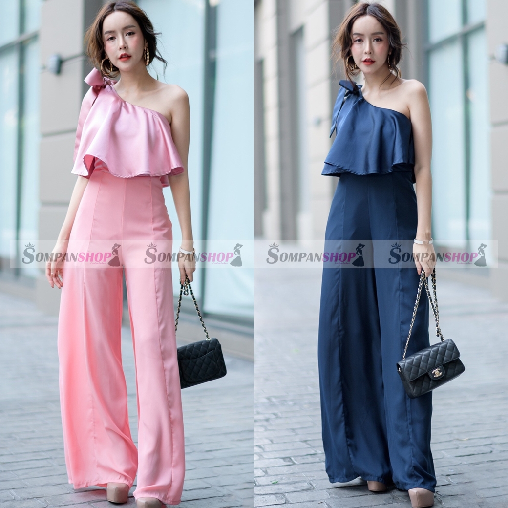 ชุดเดรสกางเกงขายาว ไหล่เฉียงแต่งระบาย ประดับโบว์ที่หัวไหล่ กางเกงขายาวทรงบาน ขากว้างสุดเก๋ ผ้าซาตินมันเงา เนื้อผ้าหนามีน้ำหนัก ดูสวยหรู สามารถใส่ได้โอกาส ทั้งใส่เป็นชุดไปงานแต่งงาน ชุดออกงาน หรือจะใส่เป็นชุดใส่ในวันหยุดสบาย จะลุคสวยเก๋ ดูดีสุดๆไปเลย