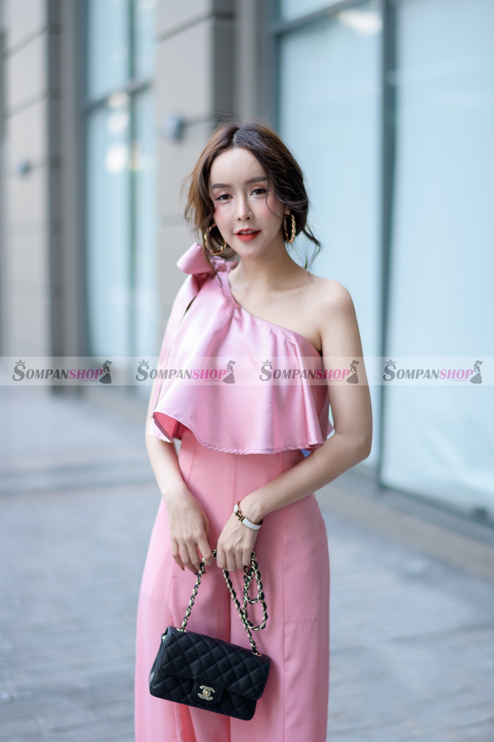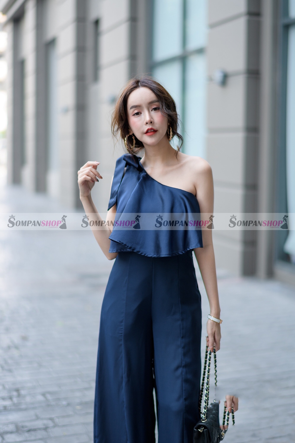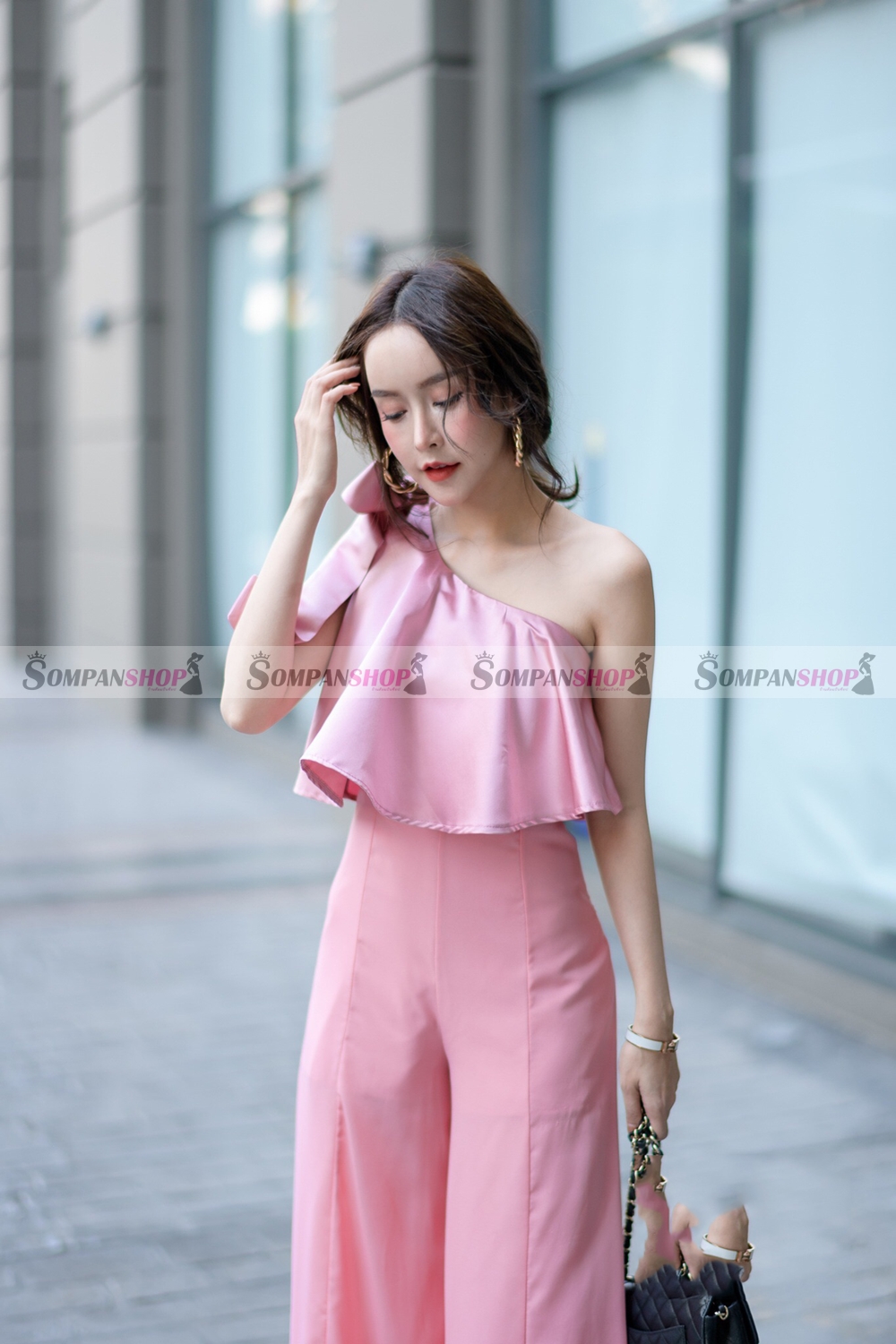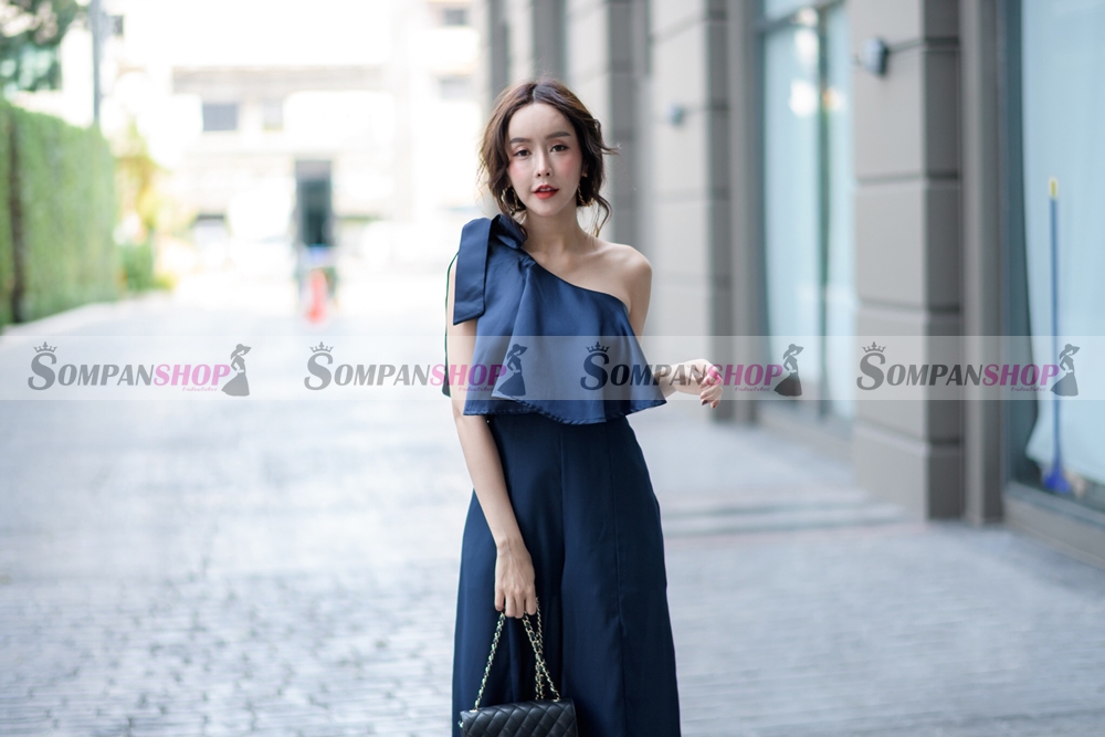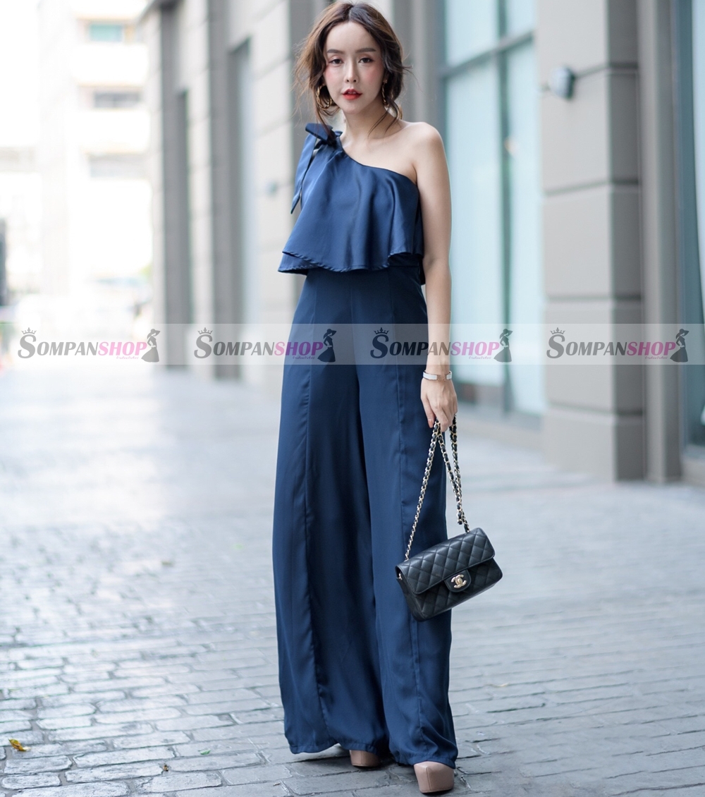 ชุดเดรสกางเกงขายาว ไหล่เฉียงแต่งระบาย ประดับโบว์ที่หัวไหล่ กางเกงขายาวทรงบาน ขากว้างสุดเก๋ ผ้าซาตินมันเงา เนื้อผ้าหนามีน้ำหนัก ดูสวยหรู สามารถใส่ได้โอกาส ทั้งใส่เป็นชุดไปงานแต่งงาน ชุดออกงาน หรือจะใส่เป็นชุดใส่ในวันหยุดสบาย จะลุคสวยเก๋ ดูดีสุดๆไปเลย